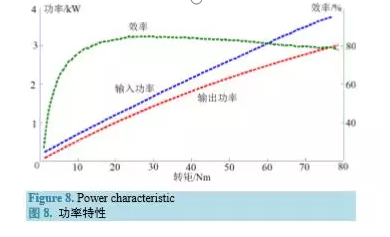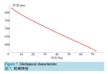 根據輪轂電機的性能要求,設計了輪轂電機的試驗項目,包括空載試驗、加載試驗、效率試驗等。下面以一臺自主研制的 3 kW 輪轂電機電機為例,進行試驗項目說明。電機的基本參數見表 2。3.1. 空載試驗 空載試驗主要測量電機的最高轉速、空載電流、損耗等[4]。試驗時,保持額定電壓不變,電機不帶 負載運行,逐步調節電機轉速至最大值,記錄電機的最高轉速、空載電流、輸入功率等參數。試驗結果 見表 3。3.2. 加載試驗 加載試驗時,給電機施加 1.5 倍額定輸出轉矩,然后逐步降低轉矩至0.25 N T ,適當選取若干個點, 記錄電機運行參數。根據所得數據,繪制電機的電流特性( inIT − 曲線)、機械特性(nT − 曲線)和功率特性 ( in PT − 、 outPT − 和 T η − 曲線),分別見圖 6~8。加載電流特性,是指輸入電流關于輸出轉矩的函數,輪轂電機的加載電流特性是一條斜率為正的直 線。機械特性,是指電機轉速關于輸出轉矩的函數。輪轂電機的機械特性是一條斜率為負的直線,與橫、 縱坐標的交點節距分別代表電機的堵轉轉矩和空載轉速。 功率特性,是指電機的輸入/輸出功率關于輸出轉矩的函數。為方便觀察,圖 8 中還給出了系統效率關于輸出轉矩的函數。3.3. 效率試驗 效率試驗的主要目的是測量電機和控制器在不同轉矩和轉速下的效率分布,并繪制系統效率 MAP 圖[5]。所謂系統效率MAP圖,是指系統效率關于電機轉速和輸出轉矩的二元函數 ( ) , f n T η = 曲面在nT − 平面的等高投影,是分析電機效率性能的重要依據。圖9給出了試驗電機的系統效率 MAP,圖中還畫出 了電機的機械特性及其擬合線。